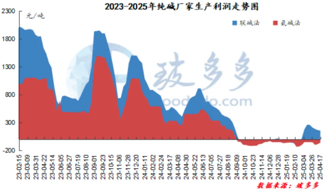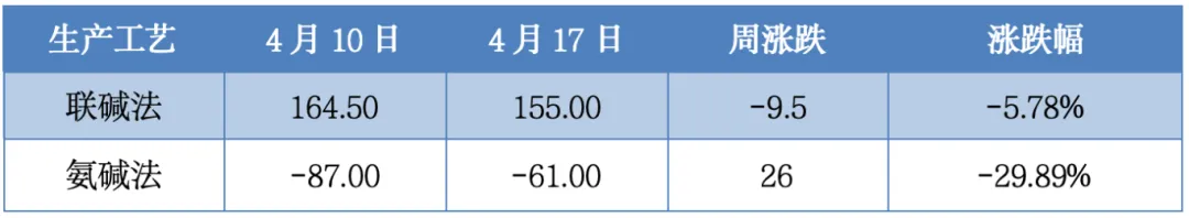 As of April 17 this week, the profit of the soda ash process was 155.00 yuan/ton, down 9.50 yuan/ton from last week; the profit of the ammonia soda process was -61.00 yuan/ton, up 26 yuan/ton from last week. The cost-end price was adjusted narrowly during the week, the price of raw salt fell, the price of coke moved up slightly, and the profit of enterprises eased slightly from the previous week.