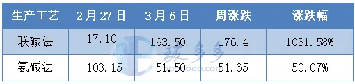 As of March 6 this week, the profit of the soda ash process was 193.50 yuan/ton, an increase of 176.40 yuan/ton from last week; the profit of the ammonia soda process was -51.50 yuan/ton, an increase of 51.65 yuan/ton from last week. The cost-end price fluctuated downward during the week, while the center of gravity of the soda ash price moved upward, and the profit recovery was obvious.