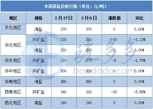 This week, the domestic raw salt market is still in a downward trend. As of Thursday this week, the mainstream ex-factory price of domestic sea salt remained at 270-390 yuan/ton, the mainstream ex-factory price of well salt was 270-380 yuan/ton, and the mainstream ex-factory price of lake salt was 230-250 yuan/ton. Affected by insufficient downstream demand during the week, the price of mineral salt generally dropped, the trading atmosphere gradually weakened, and the shipment performance of other raw salt manufacturers was general. The market price remained stable in the short term. The sea salt spring is expected to increase production, and the market supply will be further improved. In the short term, the raw salt market will remain sluggish, and the price fluctuation space is limited.